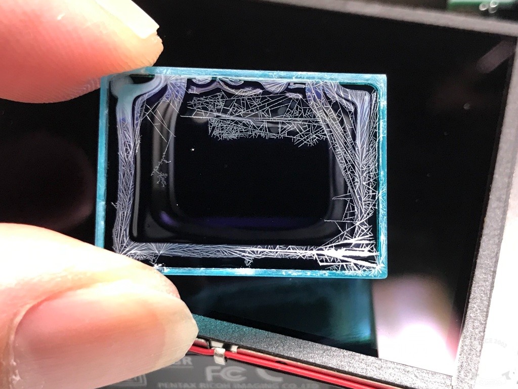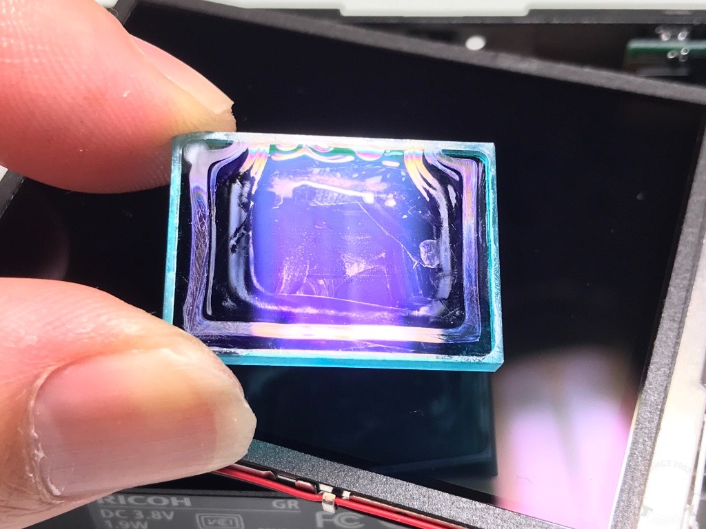通常處理的作法將入塵異物清除即可,不過這種濾鏡變質卻無法完全的清洗乾淨。 最有效的作法還是得更換此部分零件。所以如果你有思索要購買二手GR相機,請特別注意螢幕四個邊腳是否奇特形狀的暗影,因為這樣的問題多半都是從邊腳開始發生。
